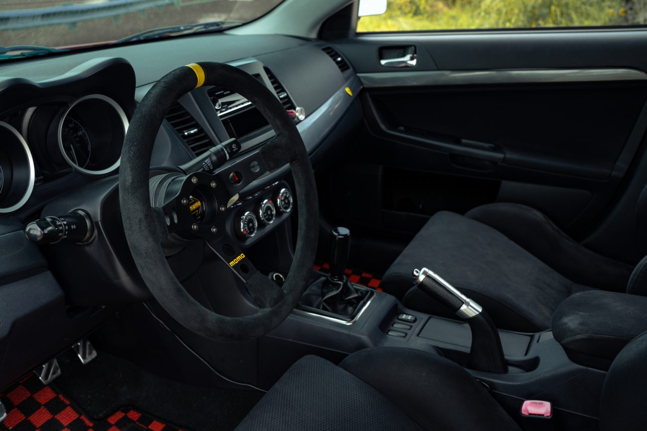 To help combat body roll and lower the car’s center of gravity, Sethum installed a set of Tein coilovers, like Whiteline’s entire catalog including swaybars, endlinks, camber/ toe arms, roll center ball joints, and tie-rod ends. Widening the Evo’s wheelbase are STM extended studs and 15mm spacers.