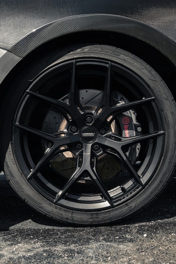 Aiding Jasiel in his time-quest is Ford’s performance Magneride Suspension found in their Performance Pack, along with sport springs and sway bars. Keeping him connected to the pavement is a set of Vossen HF-5 Hybrid Forged wheels snuggly wrapped in Nitto NT555G2. Bringing the car’s 3700lbs girth to a halt are 6-piston Brembo brakes mated to R1 Concepts drilled/slotted rotors.